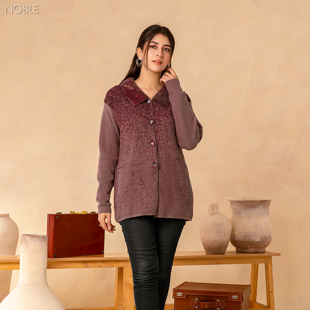 Stay cozy and stylish with this Frost Sweater Cardigan. Featuring a subtle purple pattern, this mid-length jacket is crafted from a soft, warm fabric, perfect for chilly days. The wide, collared neckline and gold-tone button front add a touch of sophistication, while the relaxed fit ensures comfort. Whether you're dressing up for a casual outing or layering for a semi-formal look, this versatile jacket is a must-have in your wardrobe. Pair it with your favorite jeans or dress for an effortlessly chic ensemble!
