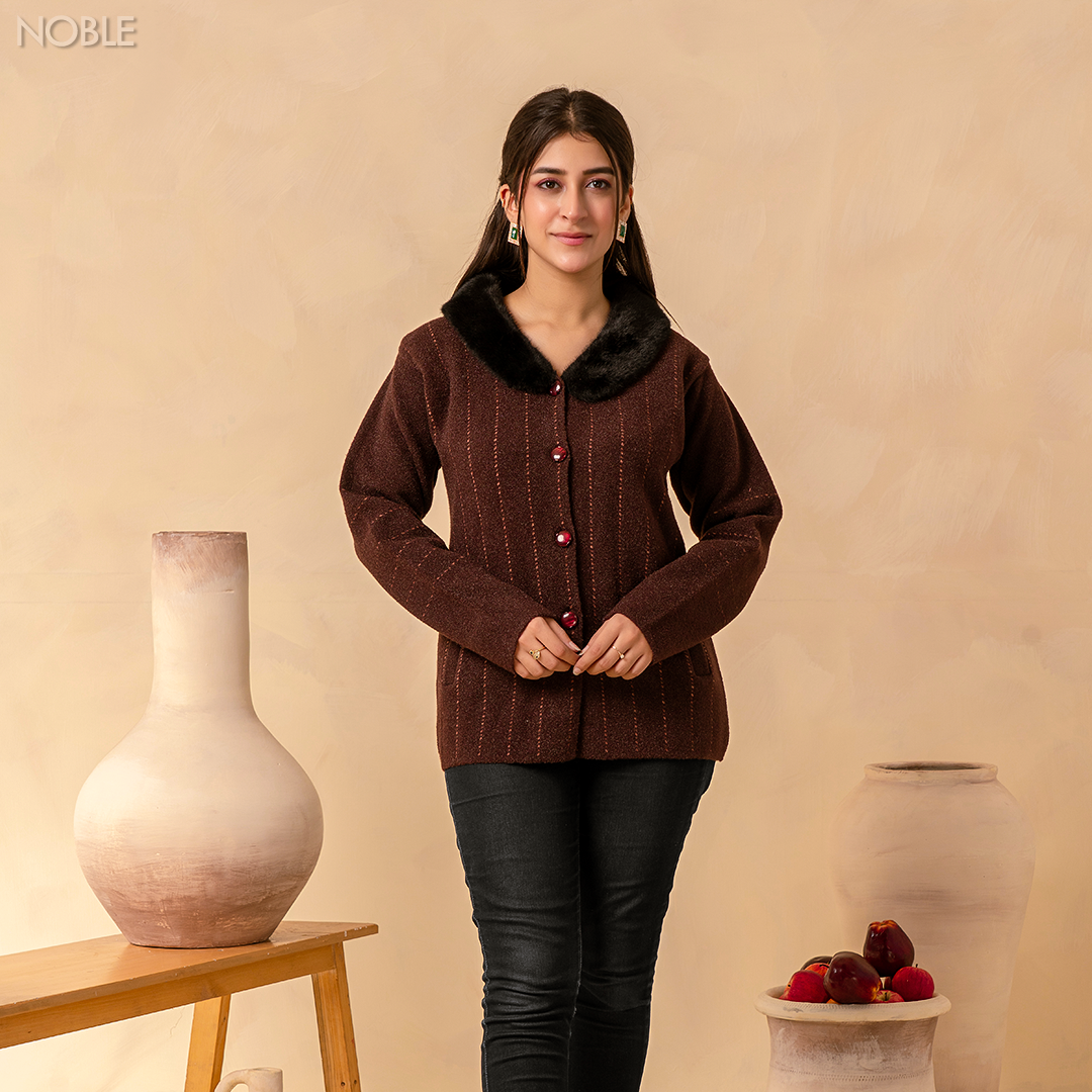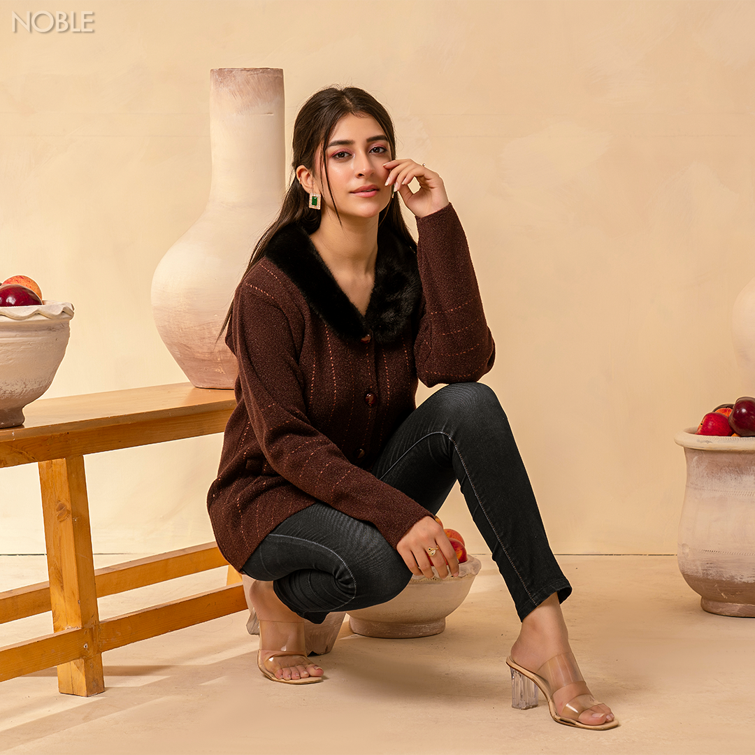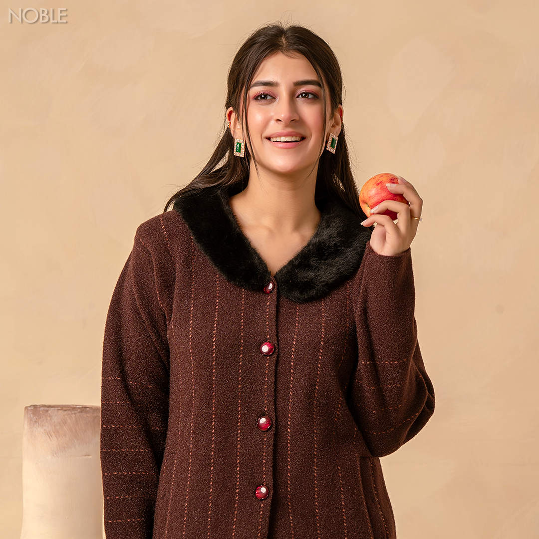 Stay cozy and stylish with this Echo Scotland Wrap. Featuring a subtle brown pattern, this mid-length jacket is crafted from a soft, warm fabric, perfect for chilly days. The wide, collared neckline and gold-tone button front add a touch of sophistication, while the relaxed fit ensures comfort. Whether you're dressing up for a casual outing or layering for a semi-formal look, this versatile jacket is a must-have in your wardrobe. Pair it with your favorite jeans or dress for an effortlessly chic ensemble!