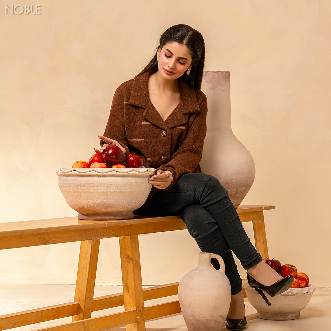Stay cozy and stylish with this elegant brown jacket. Featuring a subtle brown checkered pattern, this mid-length jacket is crafted from a soft, warm fabric, perfect for chilly days. The wide, collared neckline and gold-tone button front add a touch of sophistication, while the relaxed fit ensures comfort. Whether you're dressing up for a casual outing or layering for a semi-formal look, this versatile jacket is a must-have in your wardrobe. Pair it with your favorite jeans or dress for an effortlessly chic ensemble!