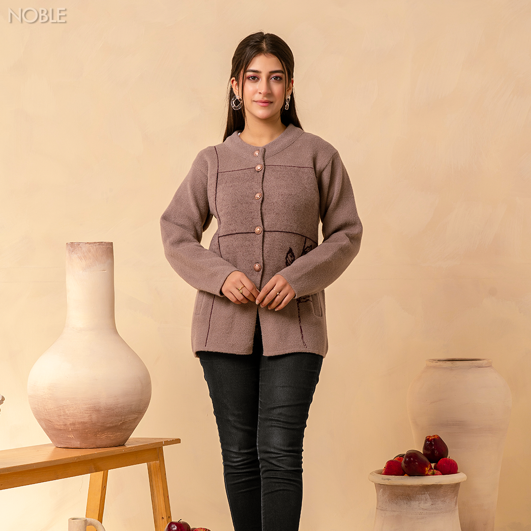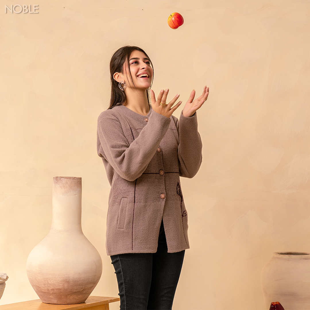 Stay cozy and stylish with this Vortex Grey Jacket. Featuring a subtle grey pattern, this mid-length jacket is crafted from a soft, warm fabric, perfect for chilly days. The wide, collared neckline and gold-tone button front add a touch of sophistication, while the relaxed fit ensures comfort. Whether you're dressing up for a casual outing or layering for a semi-formal look, this versatile jacket is a must-have in your wardrobe. Pair it with your favorite jeans or dress for an effortlessly chic ensemble!