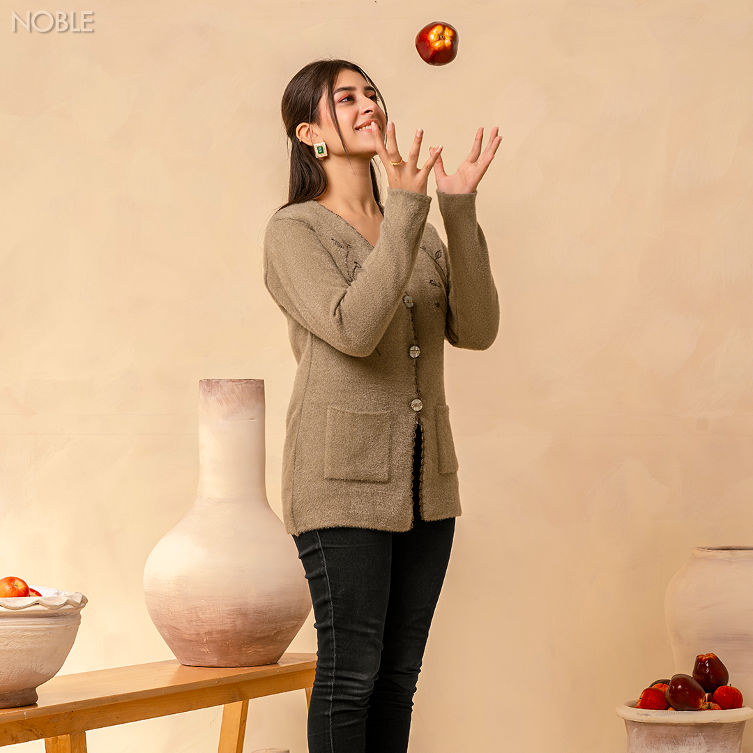 Stay cozy and stylish with this Zephyr Knit jacket. Featuring a subtle brown checkered pattern, this mid-length jacket is crafted from a soft, warm fabric, perfect for chilly days. The wide, collared neckline and gold-tone button front add a touch of sophistication, while the relaxed fit ensures comfort. Whether you're dressing up for a casual outing or layering for a semi-formal look, this versatile jacket is a must-have in your wardrobe. Pair it with your favorite jeans or dress for an effortlessly chic ensemble!
